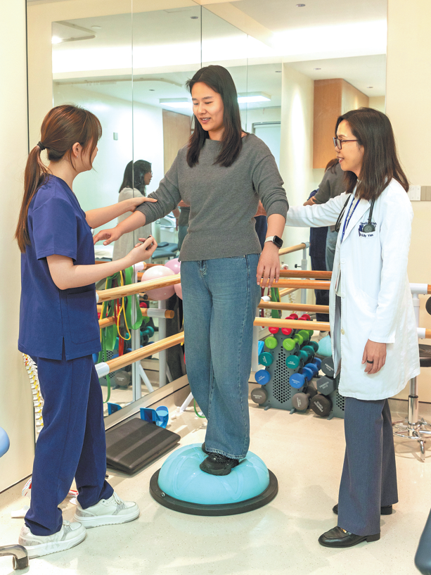A woman in her 40s takes a balance test at the longevity clinic at SinoUnited Health in Shanghai on March 19.