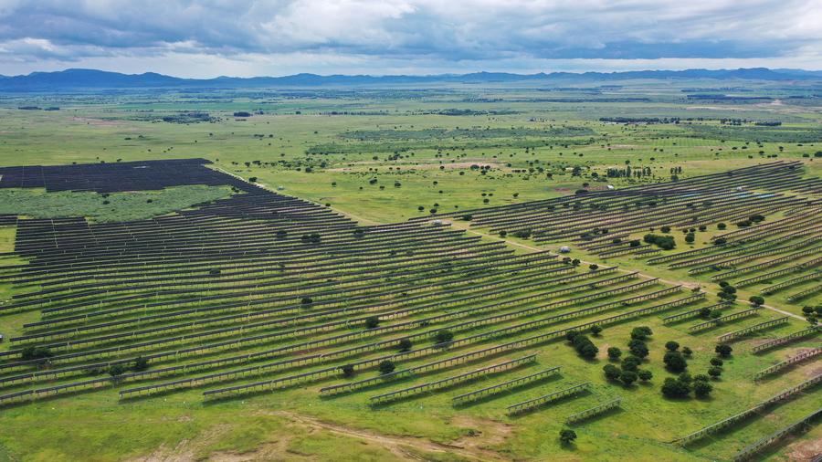 An aerial drone photo taken on July 29, 2025 shows photovoltaic panels at the site of a desertification control project integrated with wind and solar power facilities in Horqin Right Wing Middle Banner of Hinggan League, north China's Inner Mongolia Autonomous Region. (Photo: Xinhua)