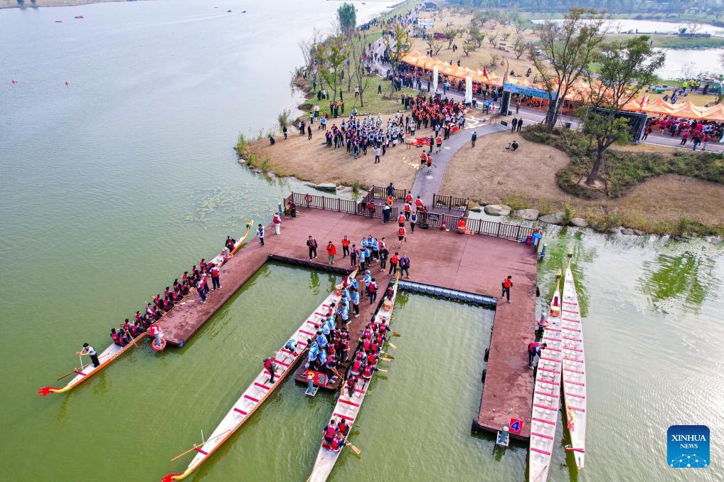 A dragon boat race is held at Zhuhai sports town in Wangguanji Town of Suqian, east China's Jiangsu Province, Oct. 26, 2025. The sports town is an eco-tourism project built upon local water environment restoration. In 2020, a comprehensive water environment improvement project was initiated in Zhuhai to tackle the problem of aquaculture tailwater, connecting local water system and turning stagnant water into flowing water.