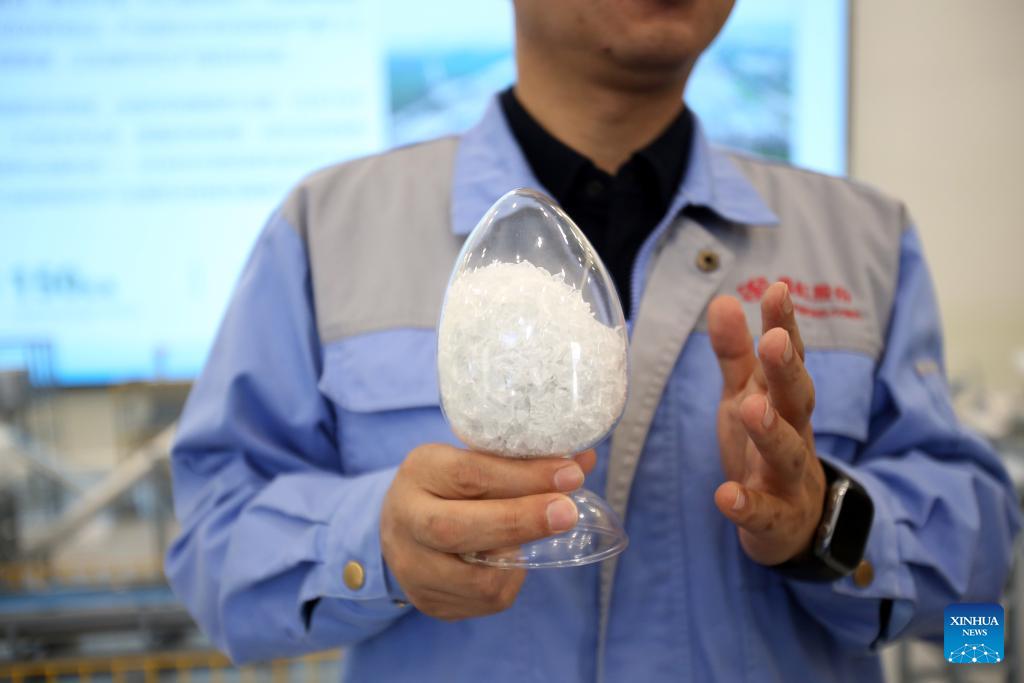 Plastic bottle fragments for making recycled polyester filaments are pictured at Ruibang Technology Co., Ltd. in Siyang County of Suqian, east China's Jiangsu Province, March 26, 2026. Ruibang is a world-leading manufacturer of recycled polyester filaments and is active in implementing zero-carbon actions in the industry.