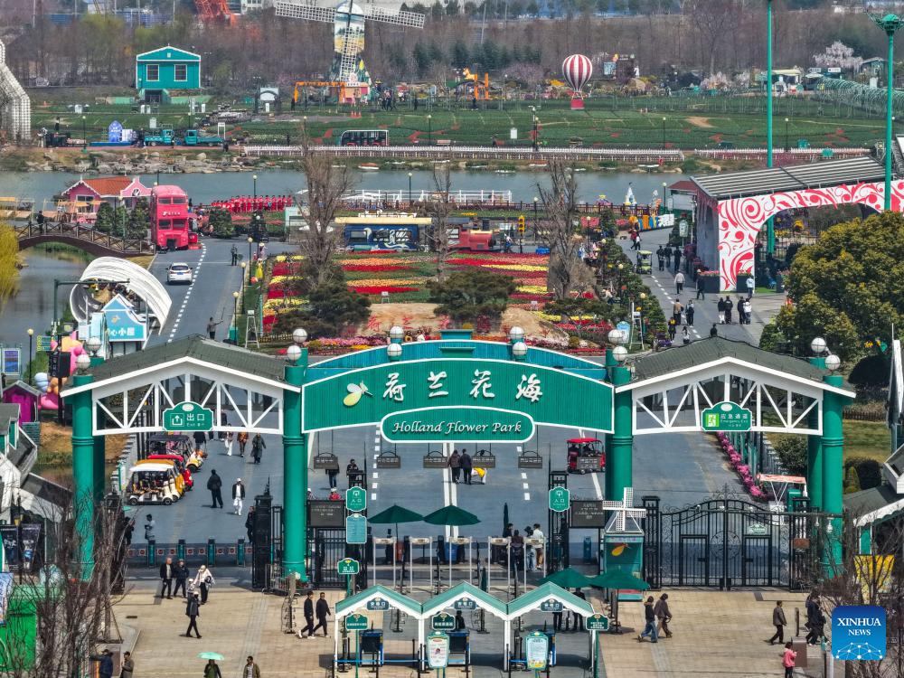 An aerial drone photo taken on March 26, 2026 shows a view of Holland flower park in Yancheng, east China's Jiangsu Province.