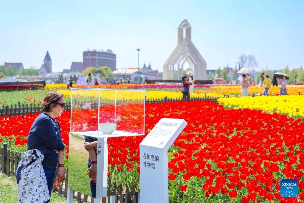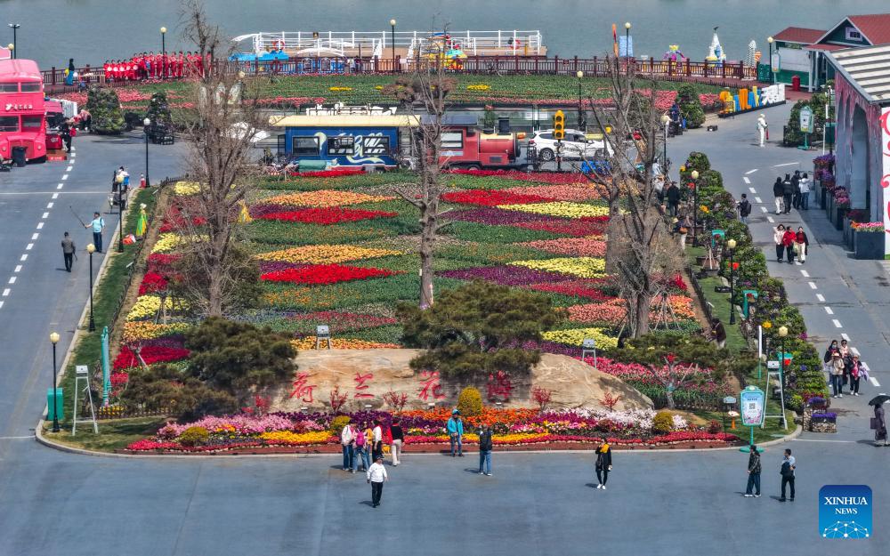 Tourists enjoy leisure time amid blooming flowers at Holland flower park in Yancheng, east China's Jiangsu Province, April 15, 2026.