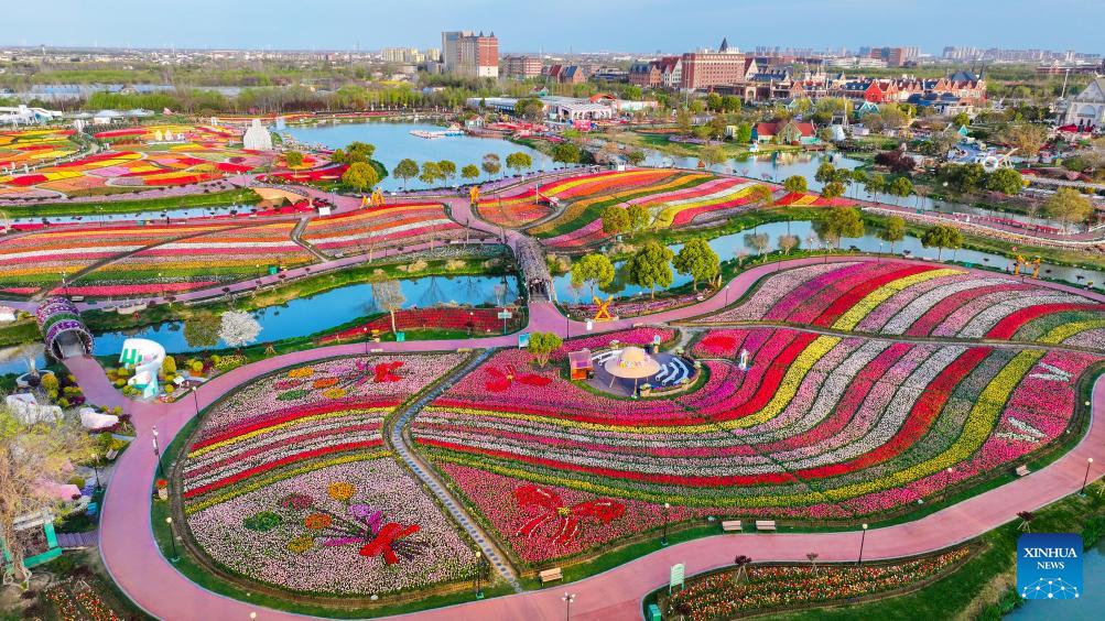 An aerial drone photo taken on April 7, 2026 shows blooming flowers at Holland flower park in Yancheng, east China's Jiangsu Province.
