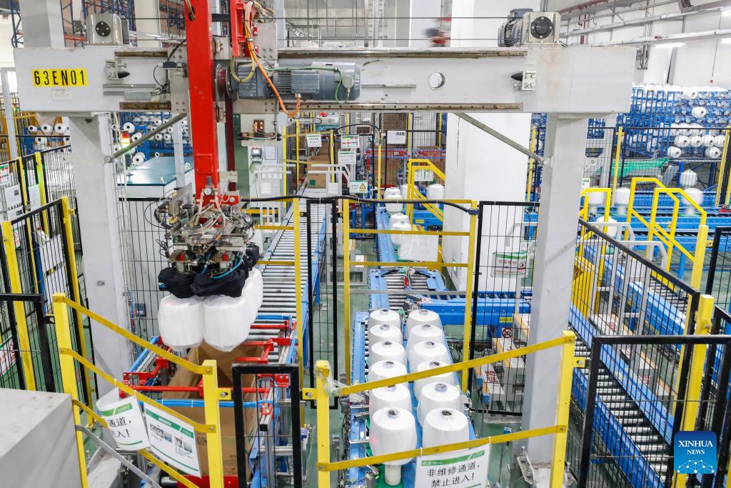 This undated file photo shows a smart workshop of Ruibang Technology Co., Ltd. in Siyang County of Suqian, east China's Jiangsu Province. Ruibang is a world-leading manufacturer of recycled polyester filaments and is active in implementing zero-carbon actions in the industry.