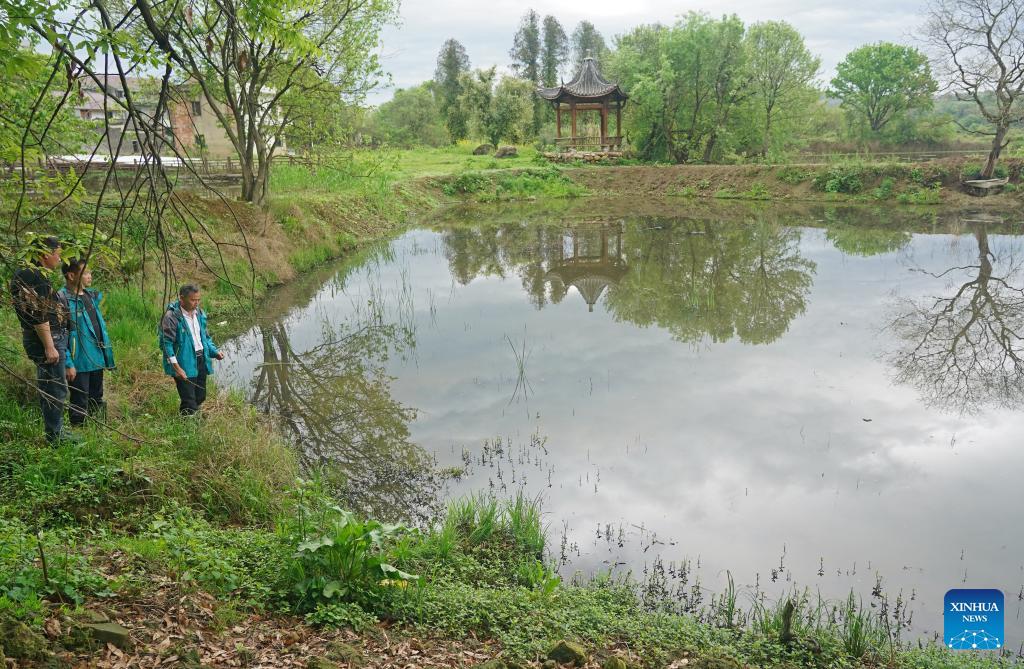 Xu Weishui (1st R) and villagers patrol beside a pond where fry were released in Dazizui Village of Duchang County, east China's Jiangxi Province, April 9, 2026.