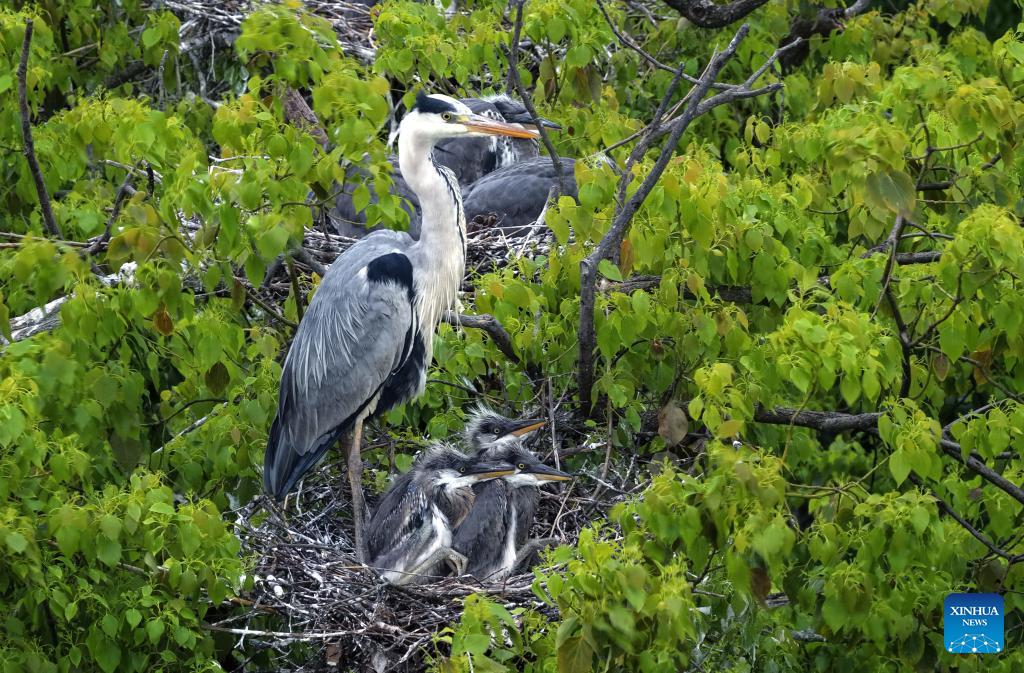 A drone photo taken on April 8, 2026 shows a grey heron and its chicks perching in a grove in Dazizui Village of Duchang County, east China's Jiangxi Province.