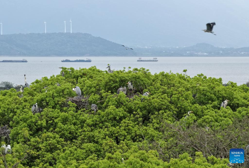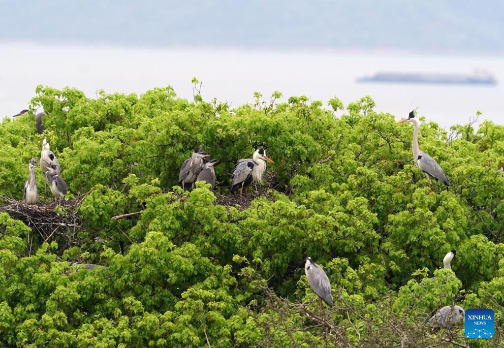 Grey herons perch in a grove in Dazizui Village of Duchang County, east China's Jiangxi Province, April 8, 2026.