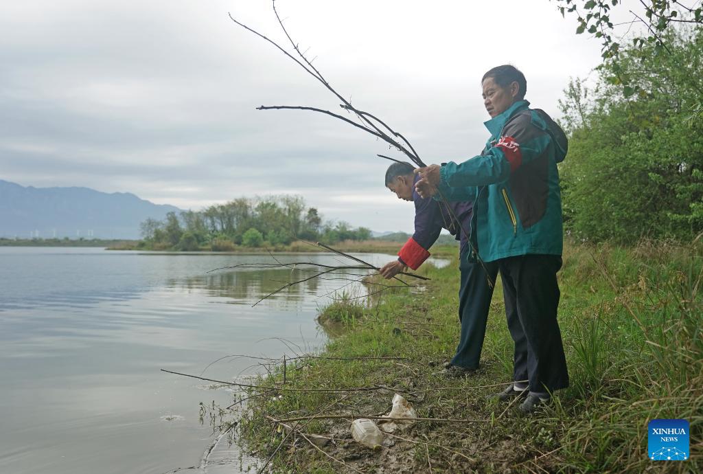 Xu Guosong (R) picks branches and places them by the lakeside to help grey herons gather nest-building materials in Dazizui Village of Duchang County, east China's Jiangxi Province, April 9, 2026.