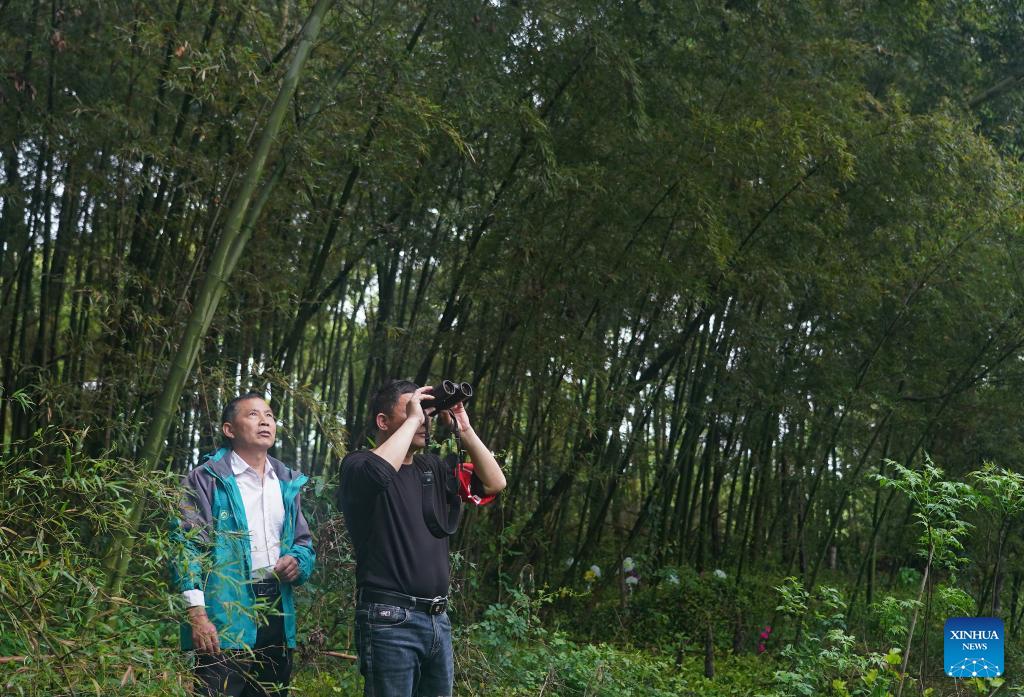 Xu Weishui (L) and a villager observe grey herons in Dazizui Village of Duchang County, east China's Jiangxi Province, April 9, 2026.