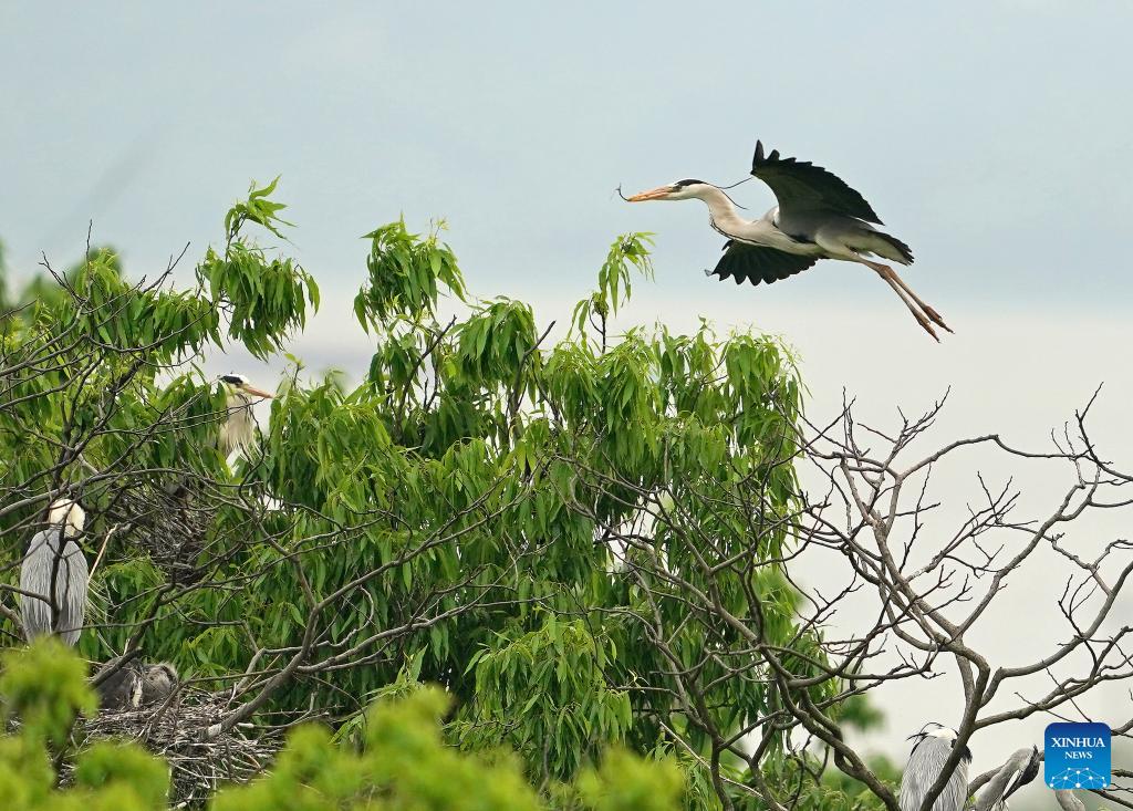 A grey heron carries a branch to build a nest in Dazizui Village of Duchang County, east China's Jiangxi Province, April 8, 2026.