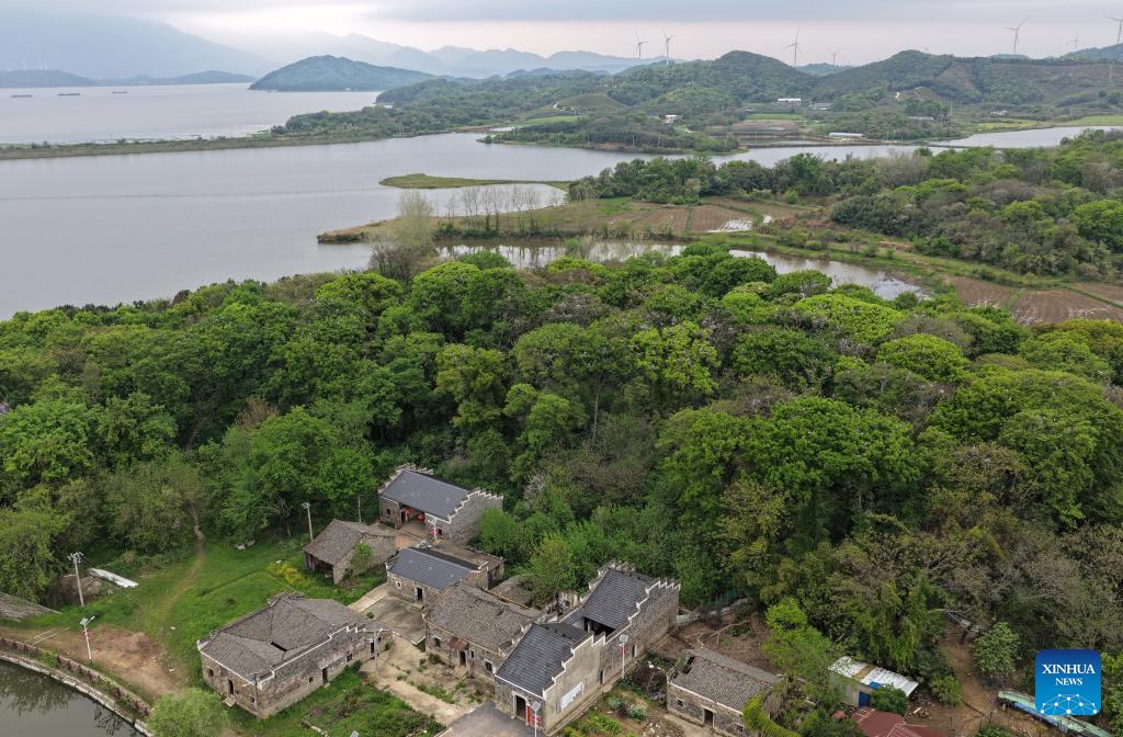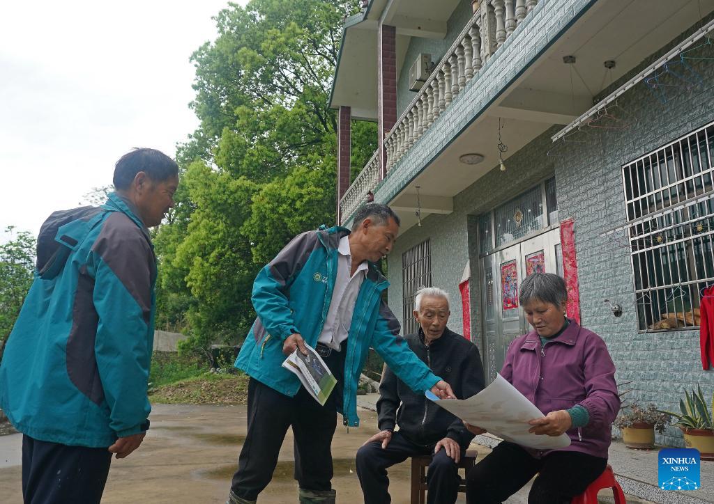 Xu Weishui (2nd L) and Xu Guosong (1st L) promote bird protection knowledge to other villagers in Dazizui Village of Duchang County, east China's Jiangxi Province, April 9, 2026.