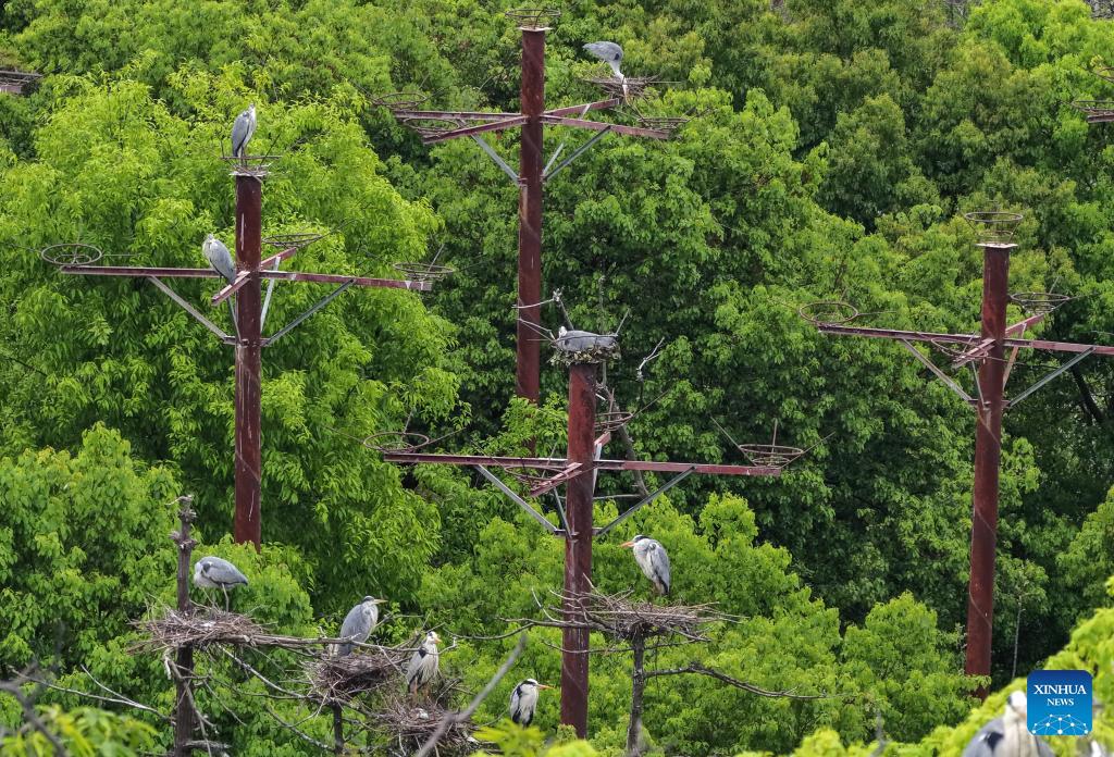 A drone photo taken on April 8, 2026 shows grey herons resting on iron racks built by villagers in Dazizui Village of Duchang County, east China's Jiangxi Province.
