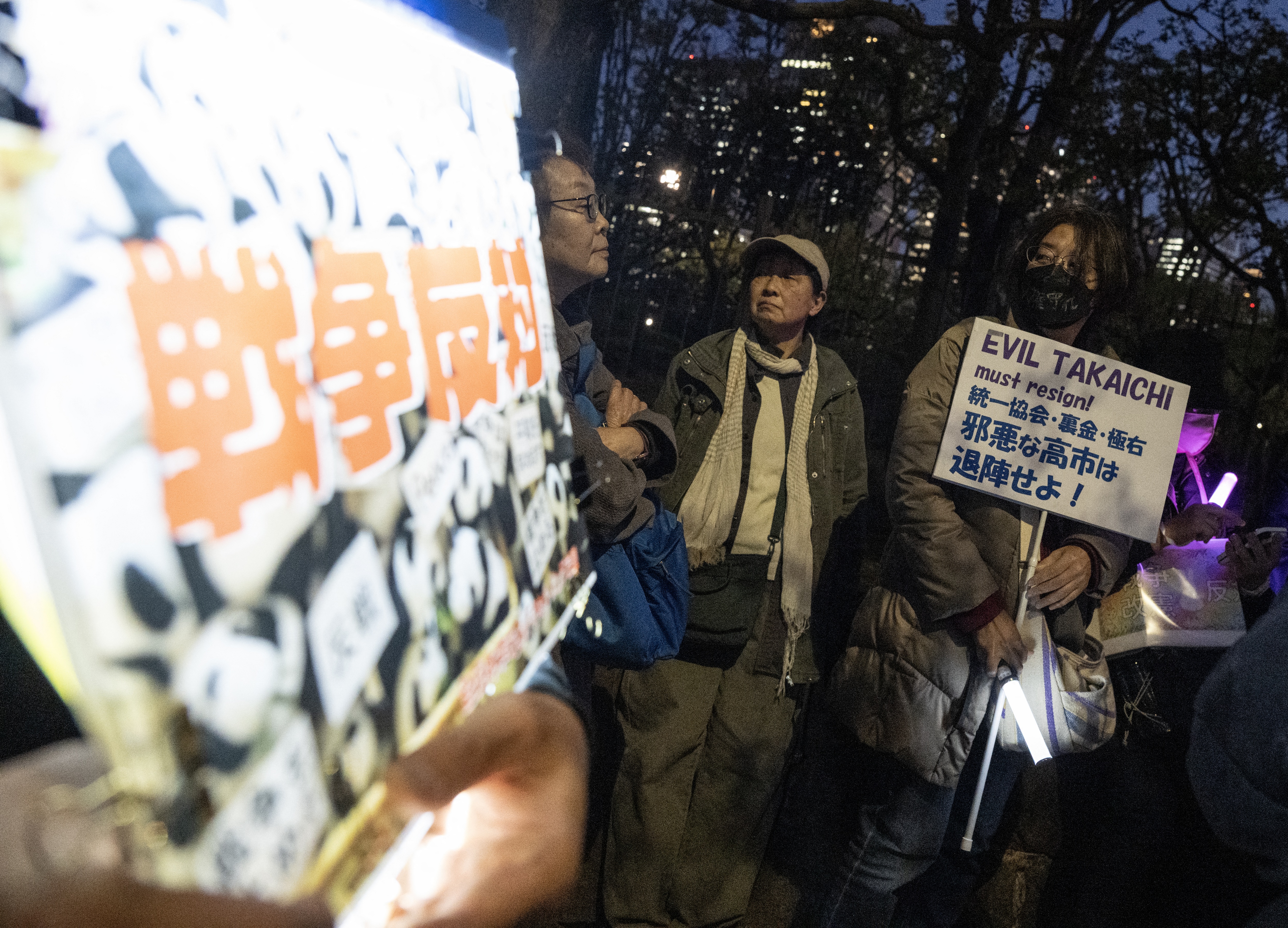 A protester holds up a placard against Japan's Prime Minister Sanae Takaichi during a demonstration by opposition political groups and activists across the street from the Diet, Japan's House of Representatives, in central Tokyo on April 8, 2026 to oppose revisions to the Constitution and protest attacks by the United States and Israel on Iran. (Photo: AFP)