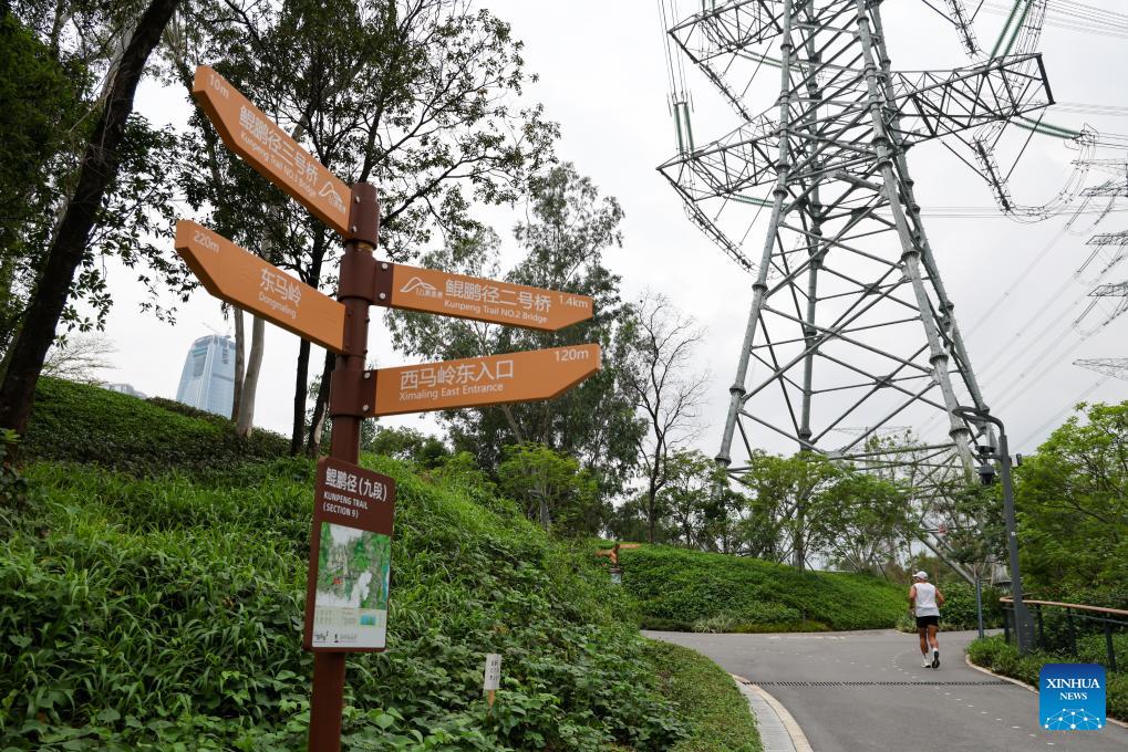 This photo taken on April 21, 2026 shows a sign board indicating Kunpeng Trail bridges in Shenzhen, south China's Guangdong Province. In recent years, Shenzhen has explored a distinctive path for biodiversity conservation in urban areas by developing ecological trails, building eco-friendly facilities and implementing refined ecological management. These efforts have reserved sufficient space for wildlife habitats and migration routes, creating "dual trails" to support the harmonious coexistence of humans and wildlife. (Xinhua/Liang Xu)