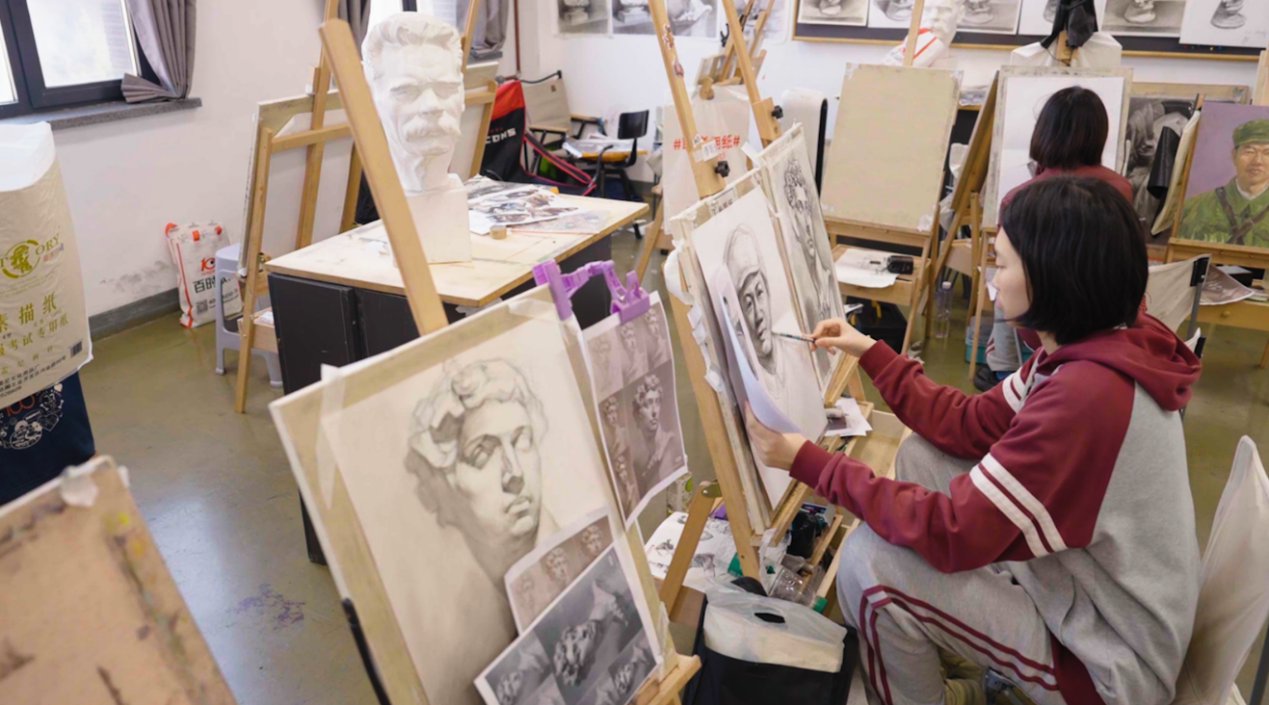 Zhao Xinyi, a student at Northeast Yucai Beihong School of Fine Arts, draws a portrait of Qian Kunhua. (People's Daily Online/Qiu Yuzhe)