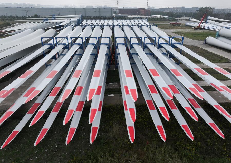 A drone photo taken on Nov. 2, 2024 shows wind turbine blades at a wind power equipment company in Rudong County of Nantong City, east China's Jiangsu Province. (File photo: Xinhua)