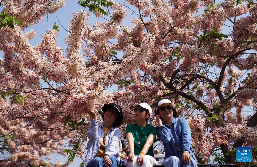 Tourists walk under flowers at a scenic spot in Nantong, east China's Jiangsu Province, April 24, 2026. (Photo by Xu Congjun/Xinhua)
