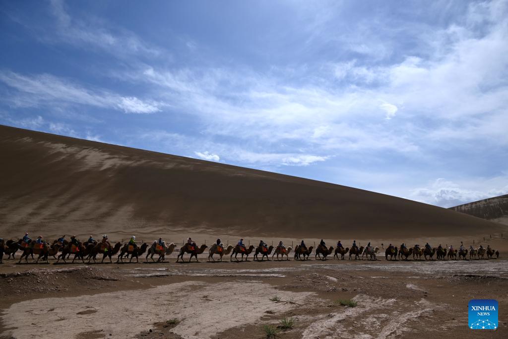 Tourists visit the Mingsha Mountain and Crescent Spring Scenic Area in Dunhuang City, northwest China's Gansu Province, April 27, 2026. As the May Day holiday approaches, the tourism markets across the country are heating up. (Photo by Zhang Xiaoliang/Xinhua)