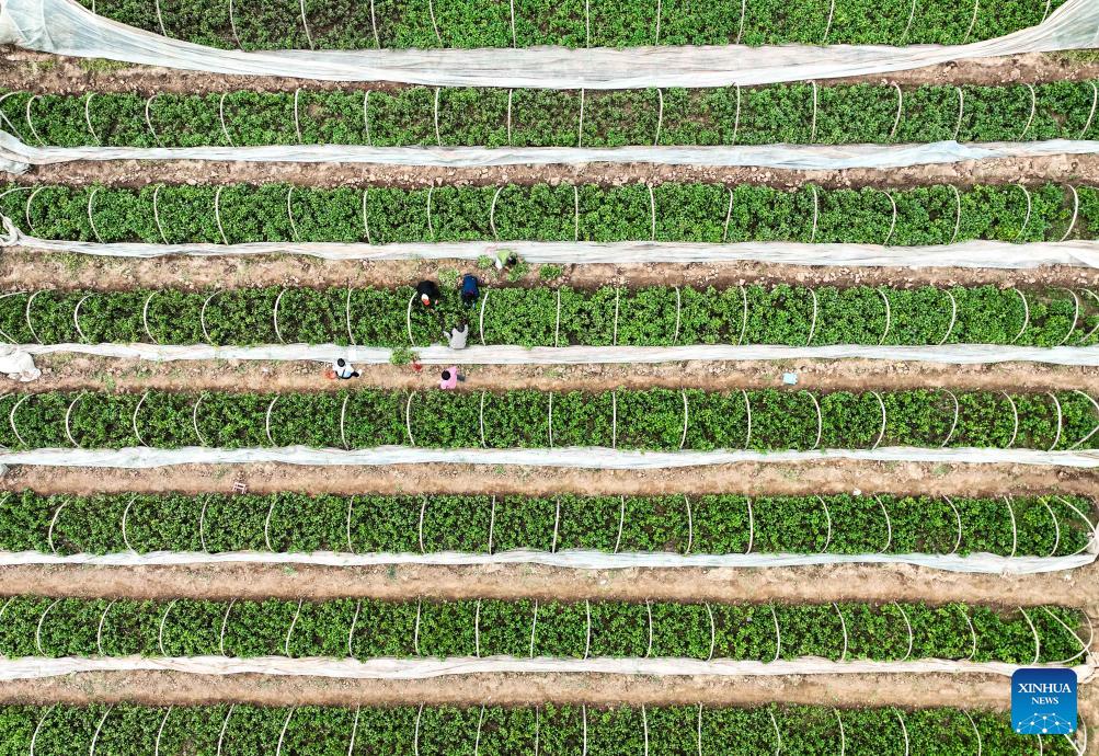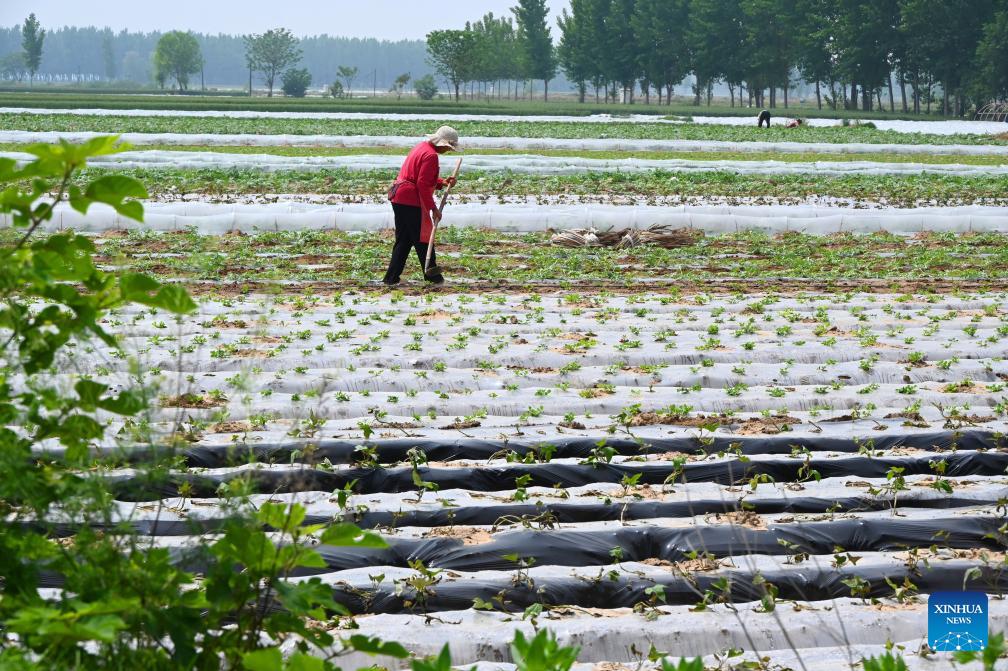 Farmers work in a field in Dongxinzhuang Town of Zunhua City, north China's Hebei Province, April 28, 2026. (Photo by Liu Mancang/Xinhua)