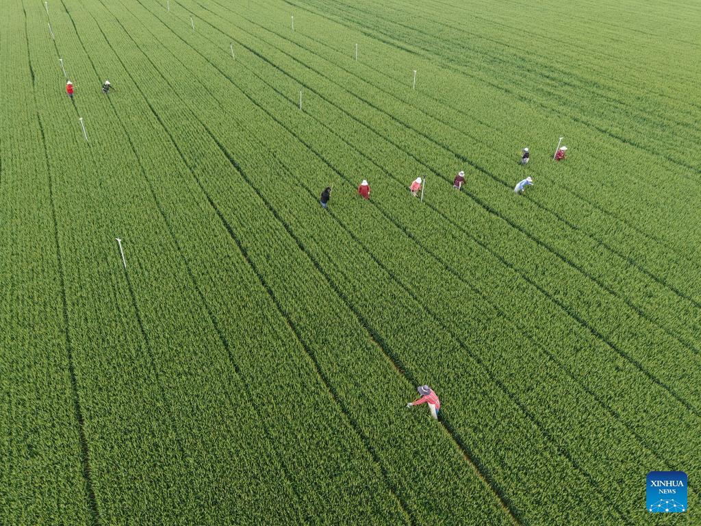 An aerial drone photo taken on April 28, 2026 shows farmers weeding in a wheat field in Diaolizhuang Village of Huangzhuang Town, Wenxian County of Jiaozuo City, central China's Henan Province. (Photo by Xu Hongxing/Xinhua)