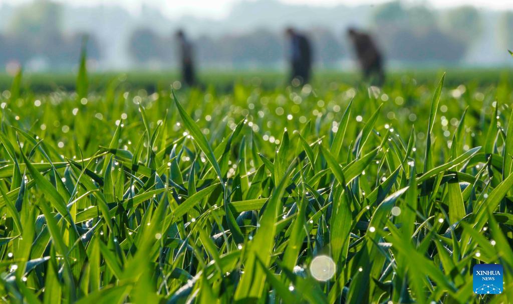 Farmers work in a field in Houbeima Village of Fantian Town, Jiaozuo City of central China's Henan Province, April 28, 2026. (Photo by Huang Fuxing/Xinhua)