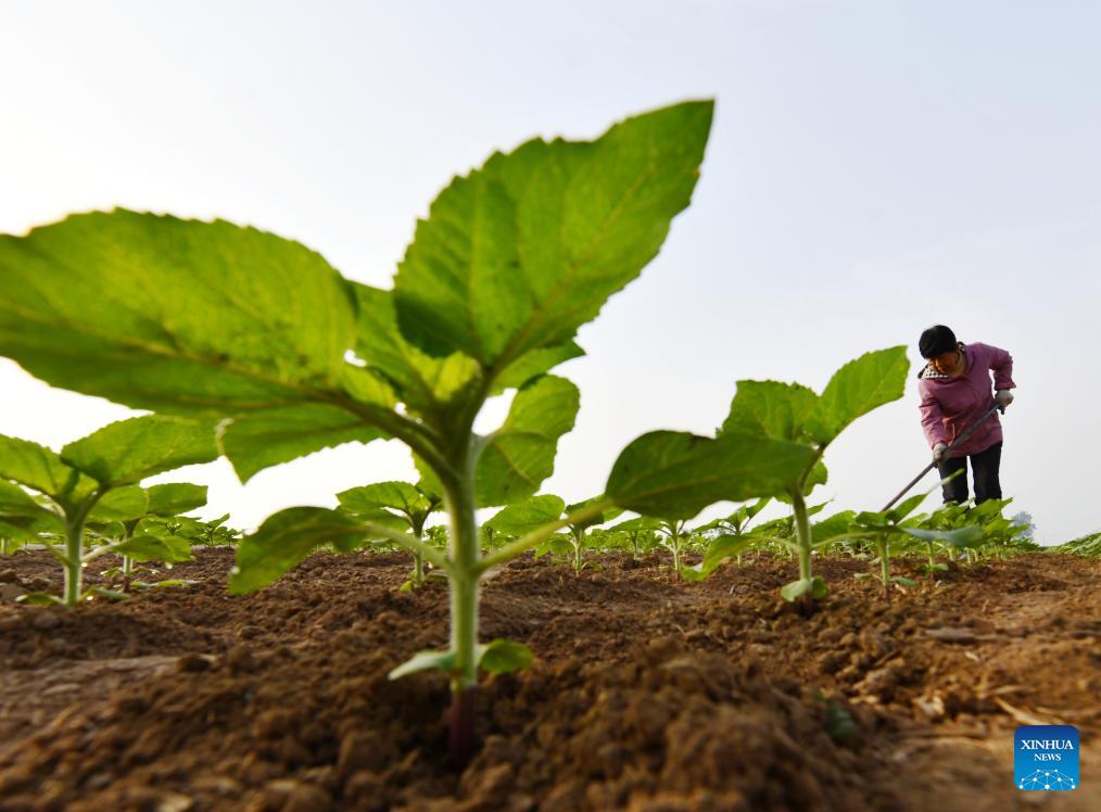 A farmer works in a sunflower field in Xiying Town of Luancheng District, Shijiazhuang City of north China's Hebei Province, April 27, 2026. (Photo by Li Mingfa/Xinhua)