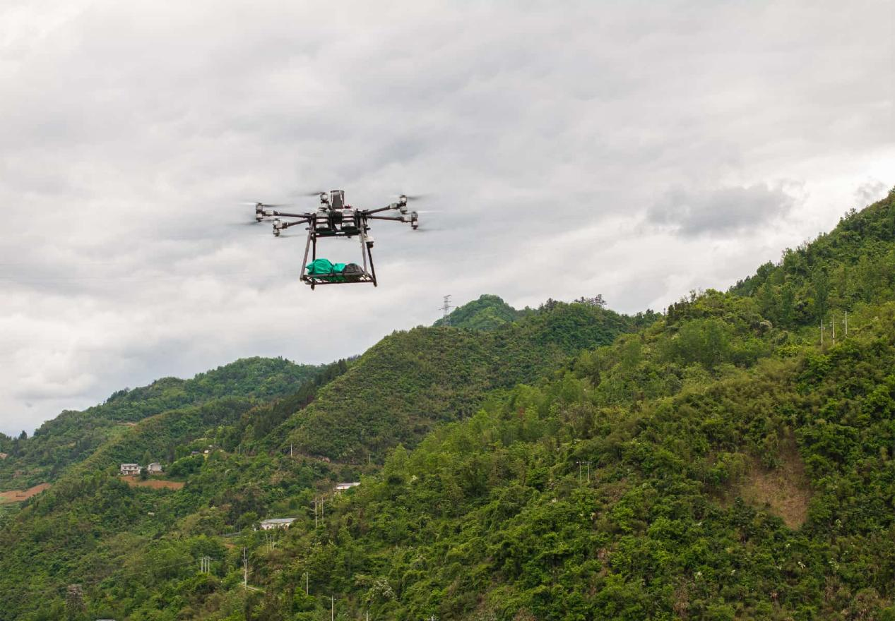 A drone delivers parcels in Zhushan county, Shiyan, Hubei Province. (Photo: Shi Ruhua)