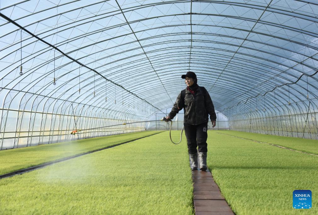 A farmer manages rice seedlings at a rice seedling breeding base under Beidahuang Group in northeast China's Heilongjiang Province, April 28, 2026. Farmers across Heilongjiang Province have been busy with spring agricultural production recently. (Photo by Li Xing/Xinhua)