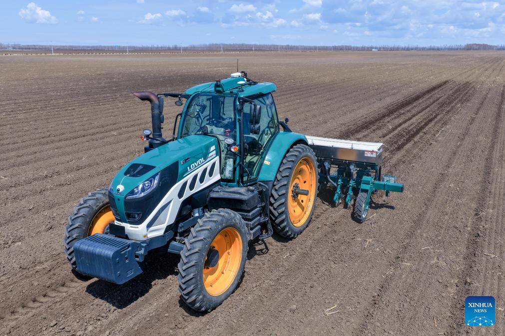 An aerial drone photo taken on April 27, 2026 shows a farmer driving an agricultural machine to prepare the field for sowing in Jinshan Town, Fujin City, northeast China's Heilongjiang Province. Farmers across Heilongjiang Province have been busy with spring agricultural production recently. (Photo by Qu Yubao/Xinhua)