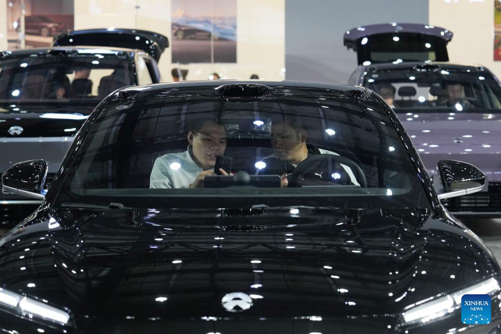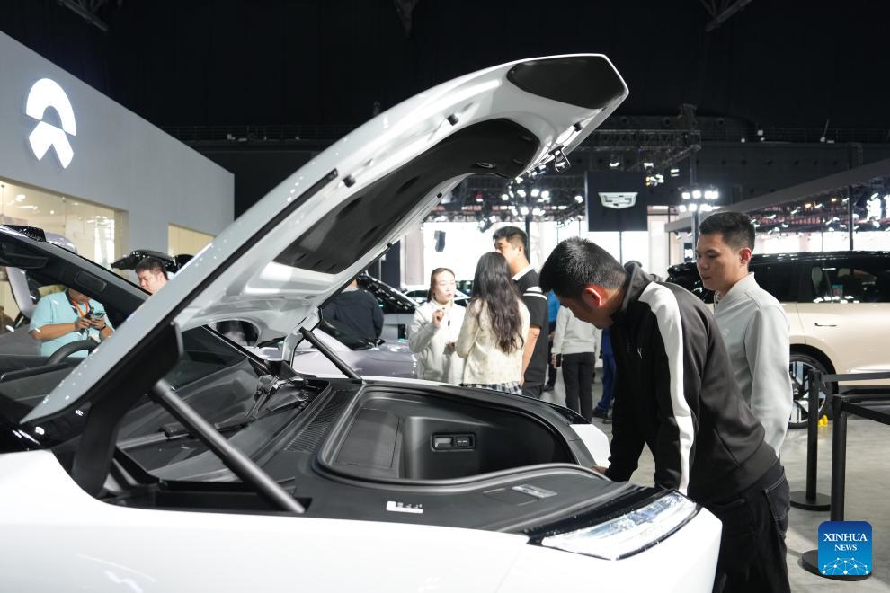 Visitors learn about a motor vehicle displayed at the 2026 Hunan Auto Show in Changsha, central China's Hunan Province, April 30, 2026. The 2026 Hunan Auto Show, with an exhibition area of more than 60,000 square meters, kicked off on Thursday at Hunan International Convention and Exhibition Center in Changsha. The auto show will run until May 5. (Xinhua/Chen Zhenhai)