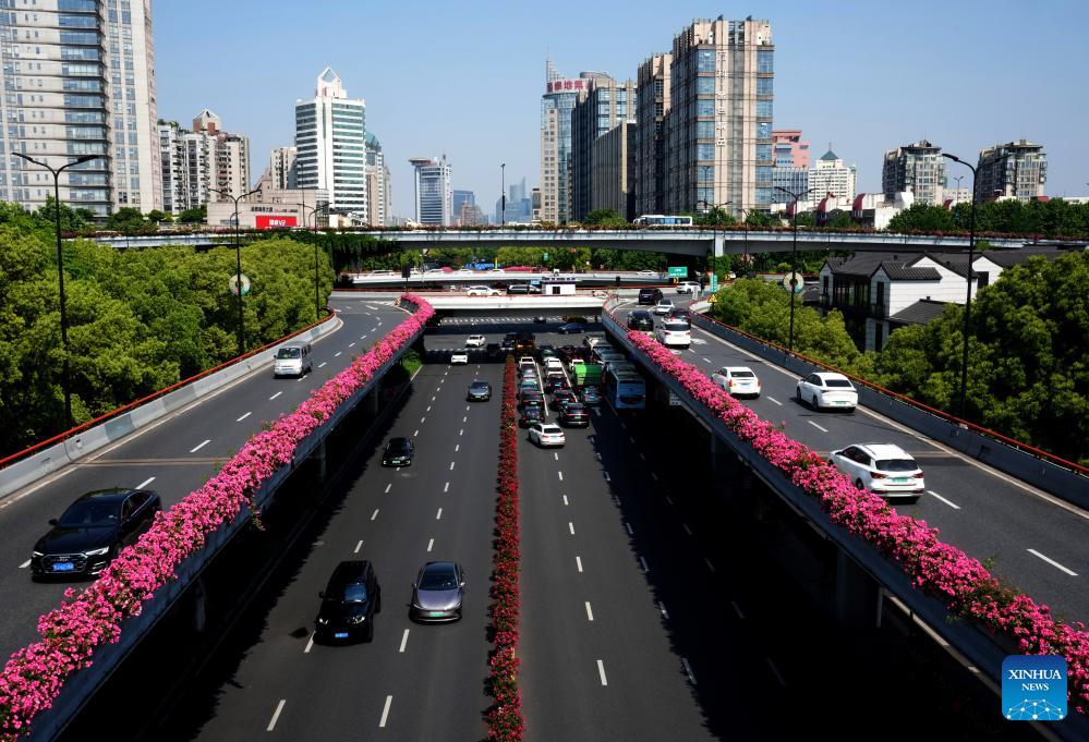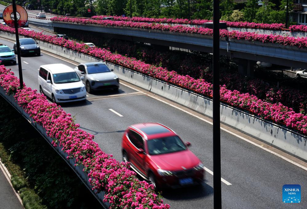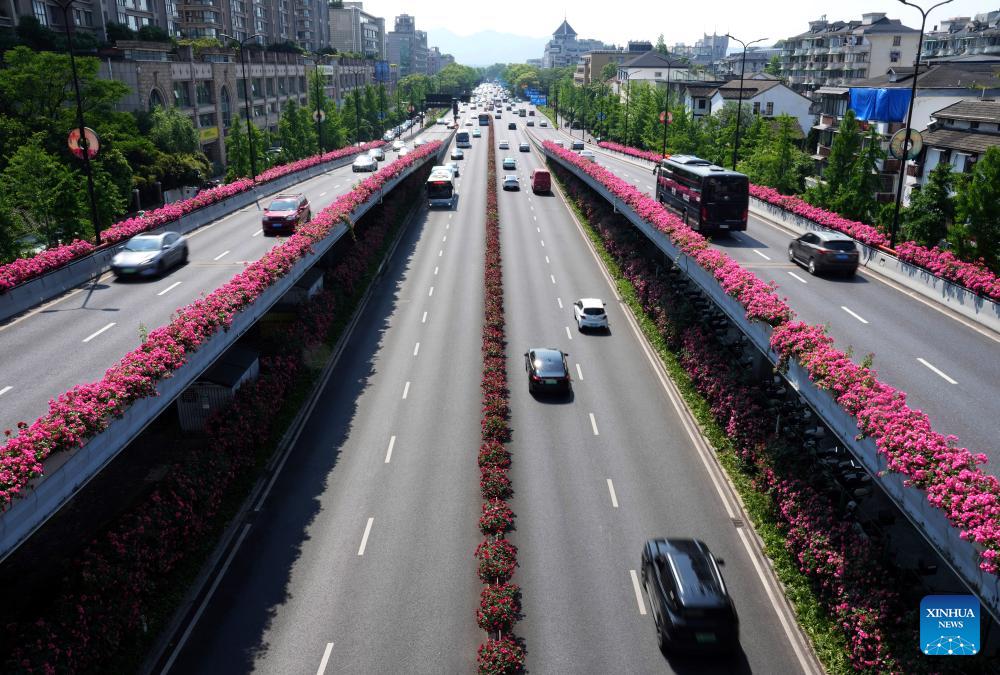 Vehicles run on an elevated road decorated with blooming Chinese roses in Hangzhou, east China's Zhejiang Province, April 30, 2026. (Xinhua/Han Chuanhao)