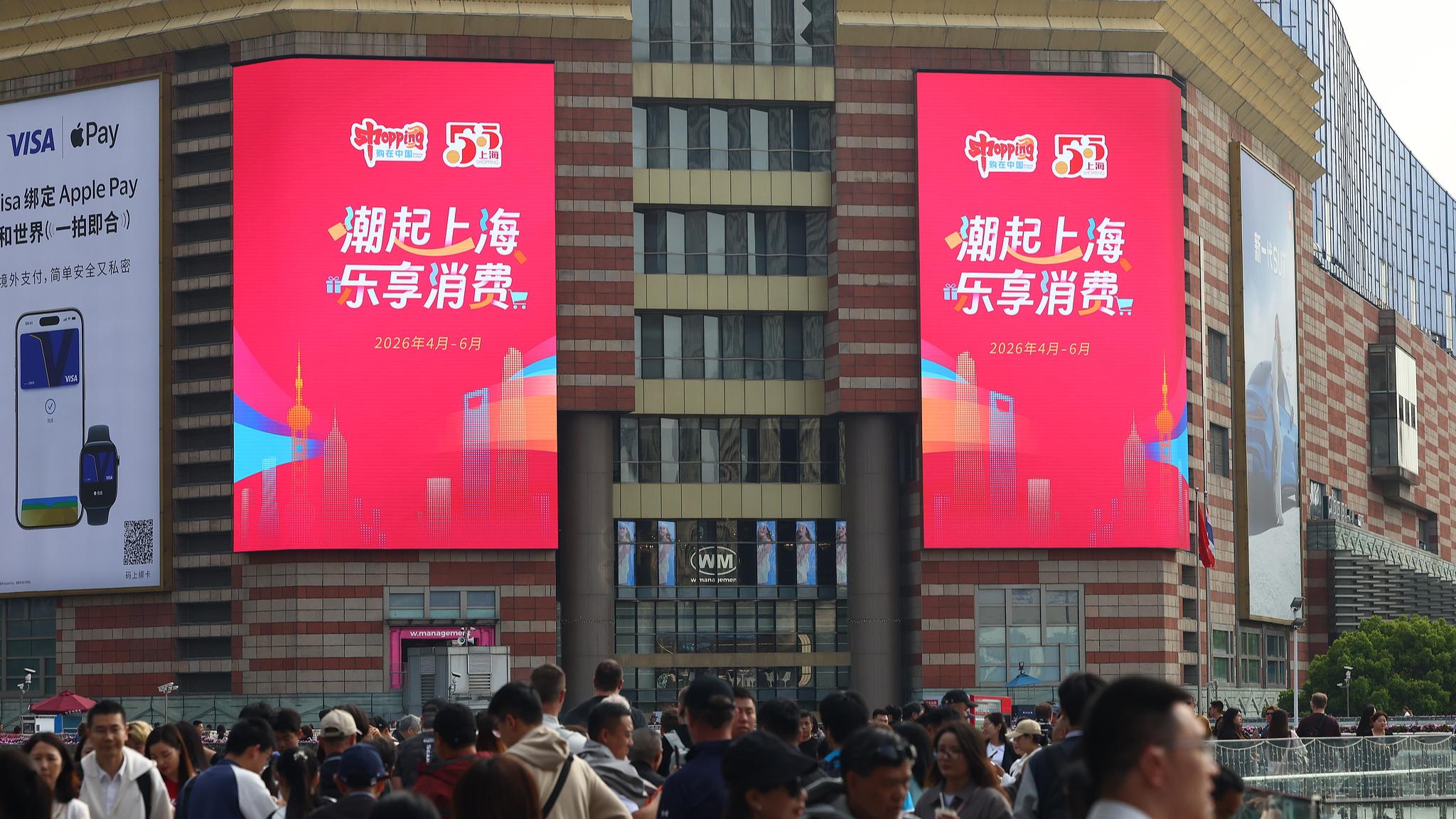 A large promotional poster for the seventh edition of the May 5 Shopping Festival in Shanghai, China, April 24, 2026. (Photo: VCG)