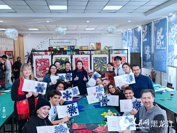 European media professionals and influencers experience paper cutting at Heilongjiang Vocational College of Art in Harbin, northeast China's Heilongjiang Province. (Photo: People's Daily Online/Shang Cheng)