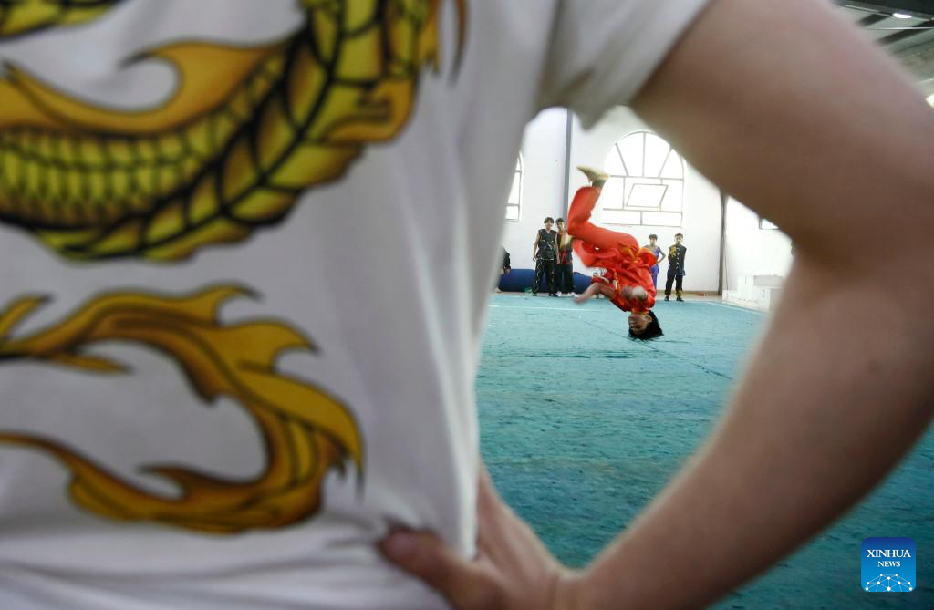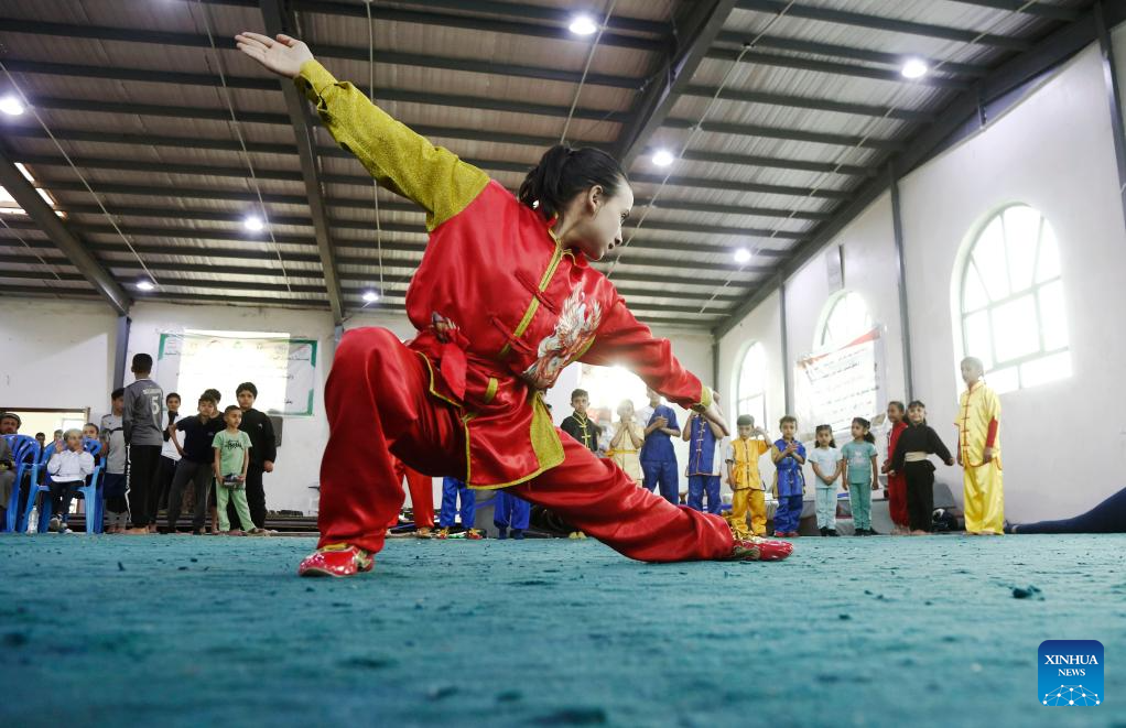 A competitor of the junior category performs during a Wushu and Kung Fu competition in Sanaa, Yemen, on Jan. 28, 2026. (Photo by Mohammed Mohammed/Xinhua)