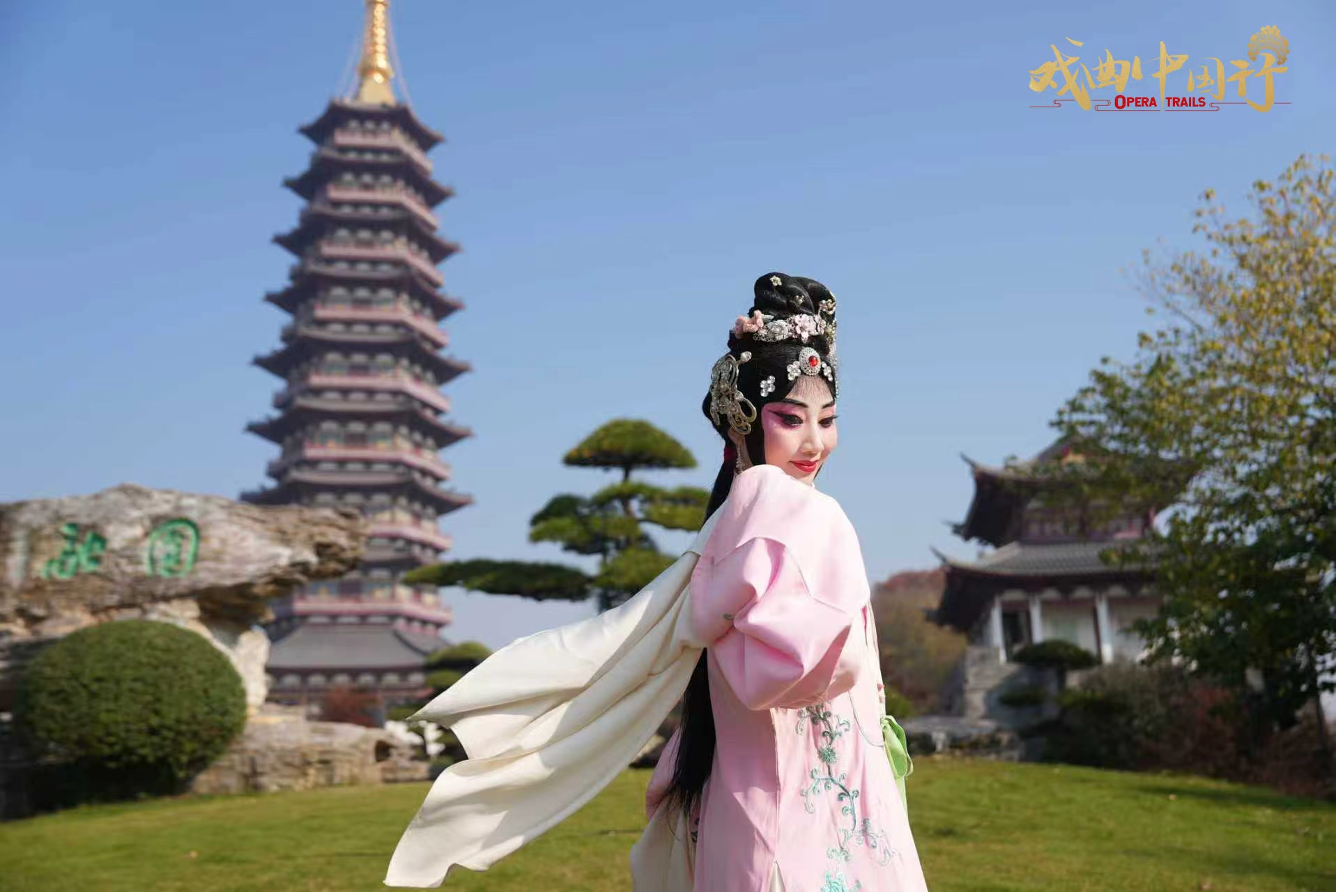 Wu Opera actress Lou Yiting stands in front of the Wanfo Pagoda in Jinhua City, east China's Zhejiang Province. /CGTN