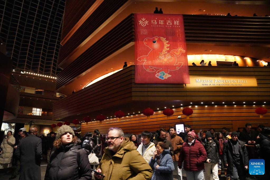People attend the Lunar New Year concert and "Ni Hao! China" tourism promotion events at the Kimmel Center for the Performing Arts in Philadelphia, the United States, Jan. 28, 2026. The Philadelphia Orchestra and the China National Tourist Office in New York marked the upcoming Lunar New Year on Wednesday with a concert and "Ni Hao! China" tourism promotion events at the Kimmel Center for the Performing Arts. (Xinhua/Zhang Fengguo)
