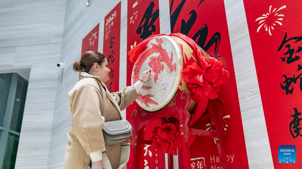 A woman beats a drum for good fortune during an exhibition on the Chinese zodiac at the China Cultural Center in Belgrade, Serbia on Feb. 12, 2025. (File photo: Xinhua)