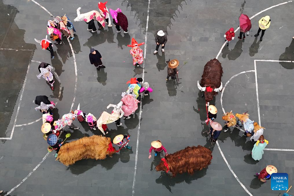 An aerial drone photo taken on Feb. 4, 2026 shows villagers taking part in an event on the occasion of "Lichun" in Guilin of south China's Guangxi Zhuang Autonomous Region. Wednesday marks "Lichun," or the Beginning of Spring, the first of the 24 solar terms on the Chinese lunar calendar. (Photo by Pan Zhixiang/Xinhua)