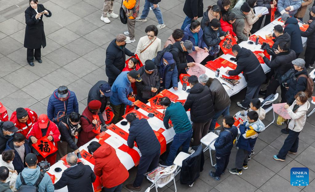 Calligraphers write the character "Fu", which means good fortune, and Spring Festival couplets for citizens and tourists on the occasion of "Lichun" in Gulou District of Nanjing, east China's Jiangsu Province, on Feb. 4, 2026. Wednesday marks "Lichun," or the Beginning of Spring, the first of the 24 solar terms on the Chinese lunar calendar. (Photo by Zhao Qirui/Xinhua)