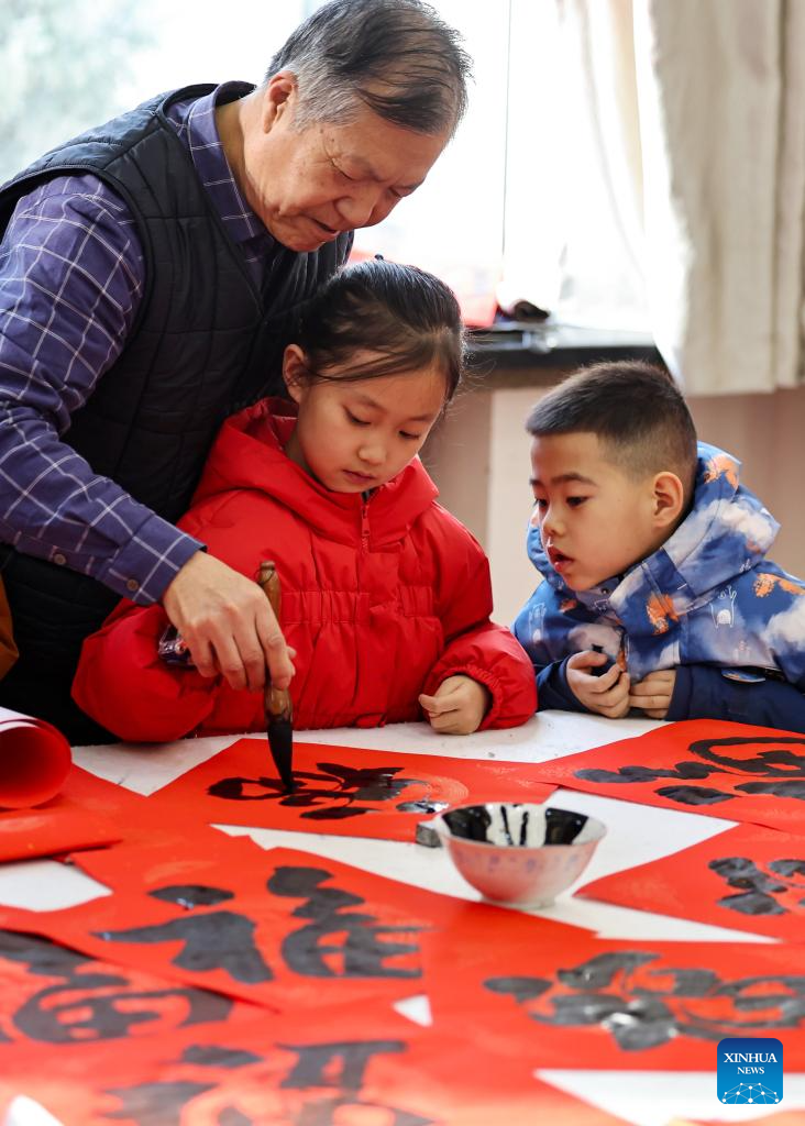 A calligraphy enthusiast teaches children to write the character "Fu", which means good fortune, on the occasion of "Lichun" in Lanzhou, northwest China's Gansu Province, on Feb. 4, 2026. Wednesday marks "Lichun," or the Beginning of Spring, the first of the 24 solar terms on the Chinese lunar calendar. (Photo by Hou Chonghui/Xinhua)