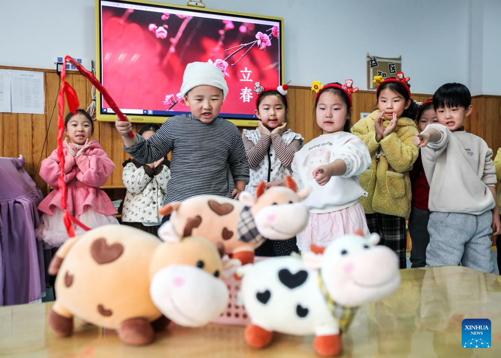 Children take part in a traditional game played on the occasion of "Lichun" at a kindergarten in Jiaozuo, central China's Henan Province, on Feb. 4, 2026. Wednesday marks "Lichun," or the Beginning of Spring, the first of the 24 solar terms on the Chinese lunar calendar. (Photo by Cheng Quan/Xinhua)