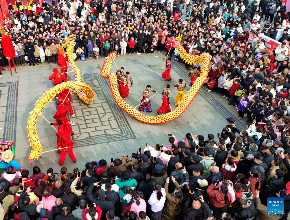 An aerial drone photo taken on Feb. 4, 2026 shows people watching a dragon dance on the occasion of "Lichun" in Nanyang, central China's Henan Province. Wednesday marks "Lichun," or the Beginning of Spring, the first of the 24 solar terms on the Chinese lunar calendar. (Photo by Gao Song/Xinhua)