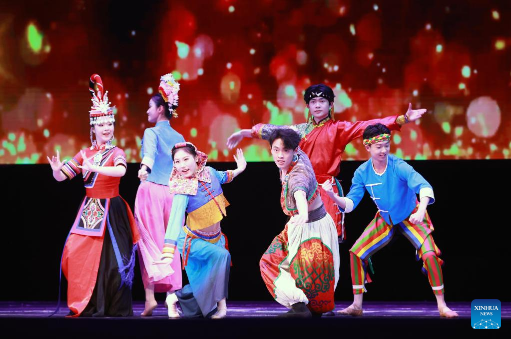 Dancers perform at the "Happy Chinese New Year in Bishkek 2026" cultural show in Bishkek, Kyrgyzstan, Feb. 4, 2026. The show was presented by a joint artistic group composed of Fujian Vocational College of Art, Fujian Acrobatic Troupe, Fujian song and dance theater, and Quanzhou Gaojia Opera Heritage Center. The program included songs, dances, magic, acrobatics, local opera, and instrumental performances. Nearly 900 people watched the show at the scene. (Photo by Roman/Xinhua)