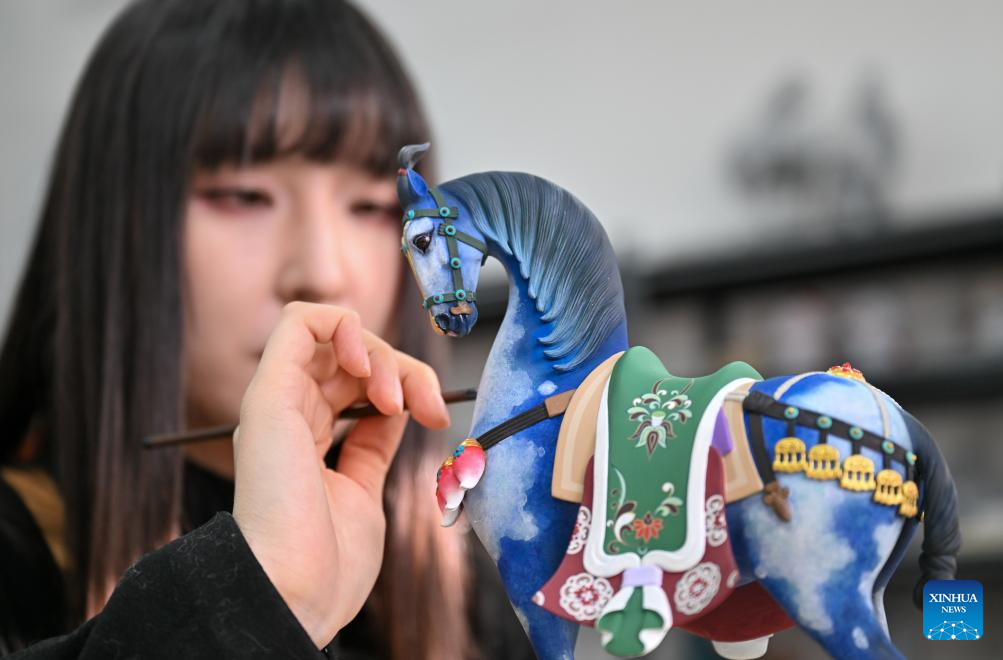 An artist paints a clay sculpture at the Tianjin Clay Figurine Zhang Painted Sculpture Working Office in Tianjin, north China, Feb. 5, 2026. The Tianjin Clay Figurine Zhang Painted Sculpture Working Office has recently designed and created a series of painted sculptures themed on the Year of the Horse to greet the Chinese New Year. These artworks will be part of a Year of the Horse themed exhibition at the Tianjin Museum, which will be be open to the public free of charge during the Spring Festival. (Xinhua/Sun Fanyue)