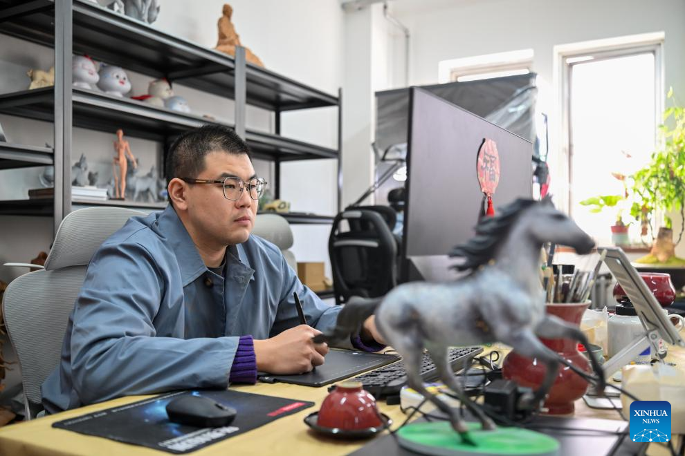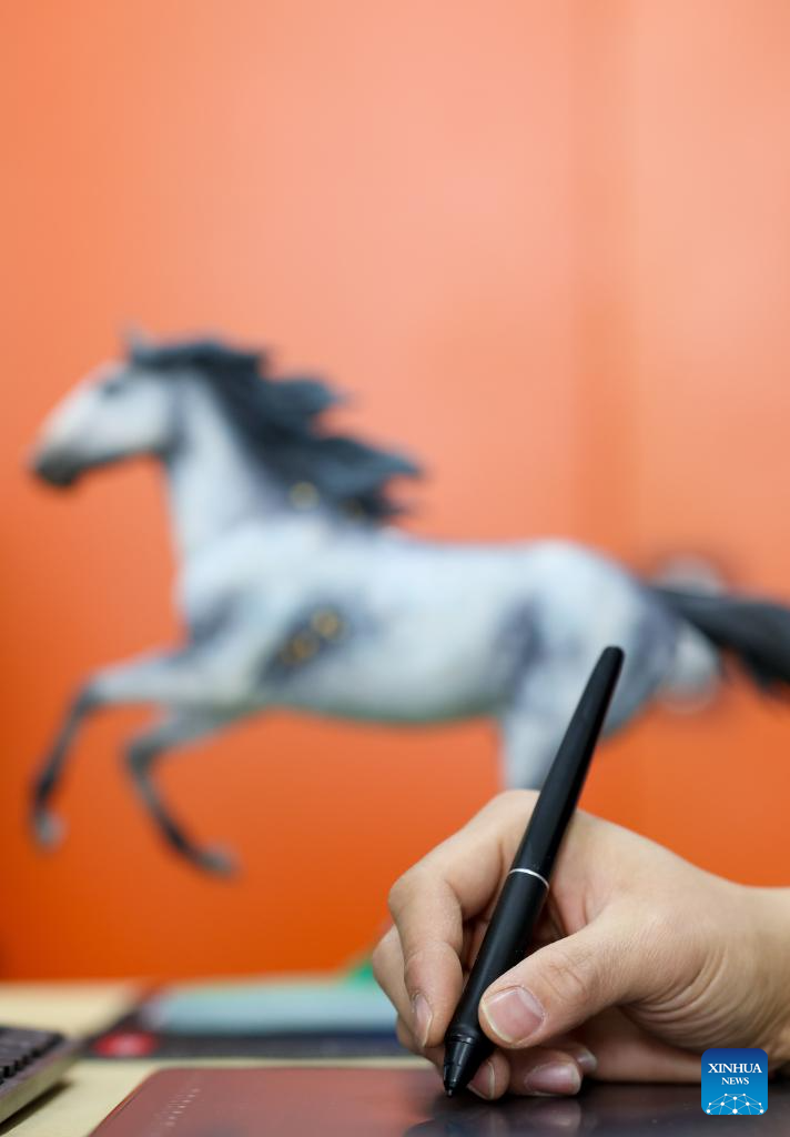 An artist creates with an electronic pen on a computer at the Tianjin Clay Figurine Zhang Painted Sculpture Working Office in Tianjin, north China, Feb. 5, 2026. The Tianjin Clay Figurine Zhang Painted Sculpture Working Office has recently designed and created a series of painted sculptures themed on the Year of the Horse to greet the Chinese New Year. These artworks will be part of a Year of the Horse themed exhibition at the Tianjin Museum, which will be be open to the public free of charge during the Spring Festival. (Xinhua/Sun Fanyue)