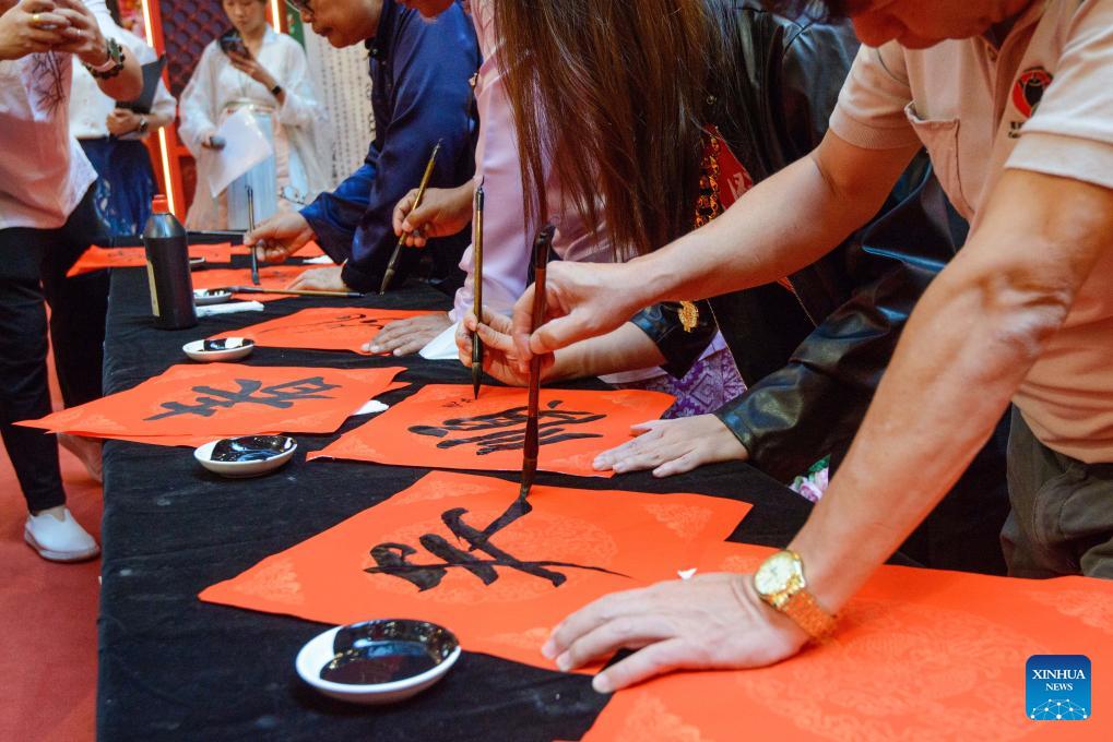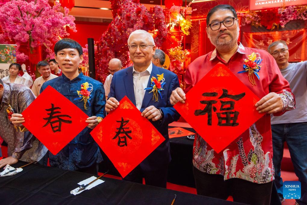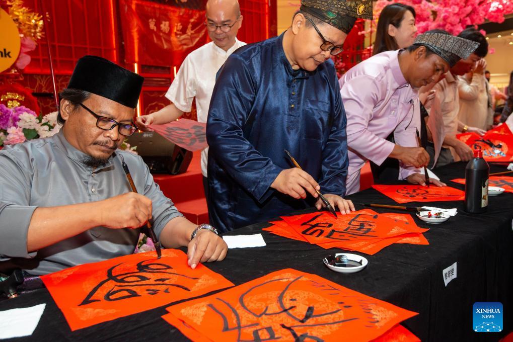 People participate in a calligraphy event in celebration of the upcoming Spring Festival in Kuala Lumpur, Malaysia, Feb. 8, 2026. (Photo by Chong Voon Chung/Xinhua)