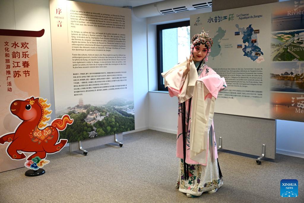 An artist performs Kunqu Opera during a promotional event for culture and tourism of east China's Jiangsu Province at the China Cultural Center in Luxembourg, Feb. 7, 2026. (Xinhua/Lyu You)
