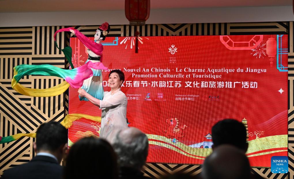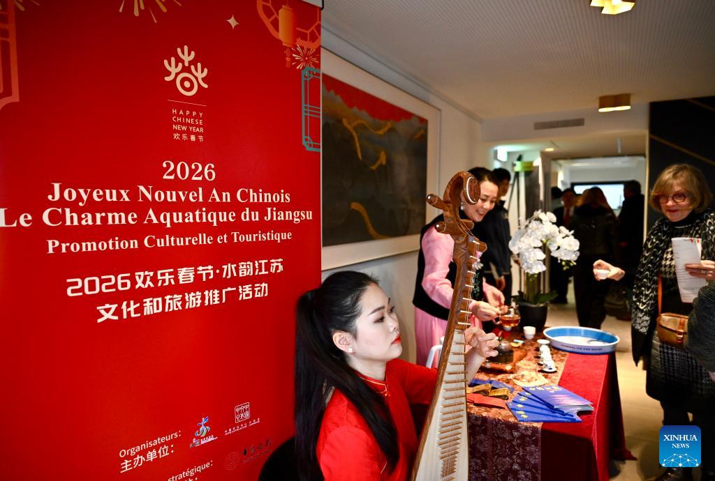 This photo taken on Feb. 7, 2026 shows a scene during a promotional event for culture and tourism of east China's Jiangsu Province at the China Cultural Center in Luxembourg. (Xinhua/Lyu You)