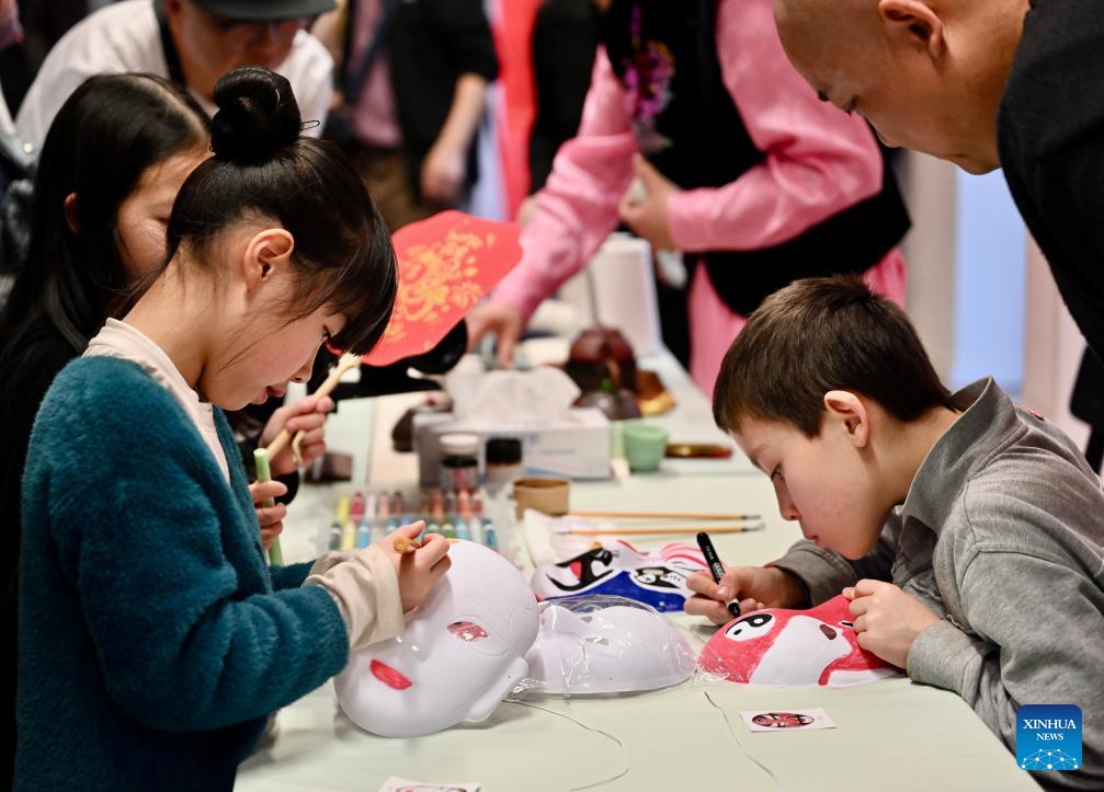 Children paint Chinese opera masks during a promotional event for culture and tourism of east China's Jiangsu Province at the China Cultural Center in Luxembourg, Feb. 7, 2026. (Xinhua/Lyu You)