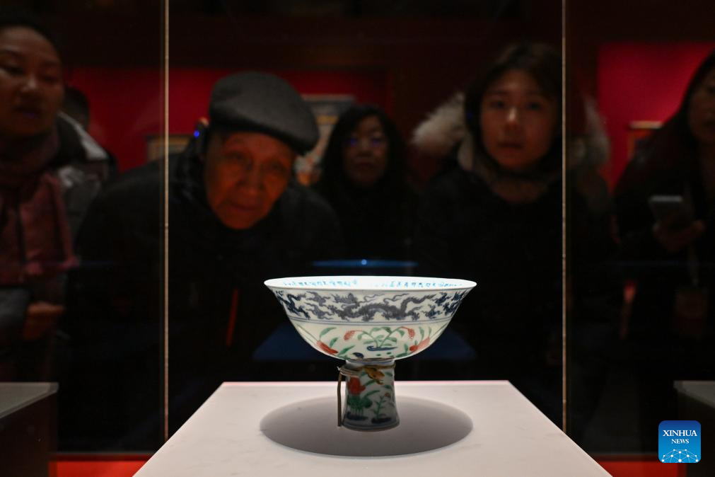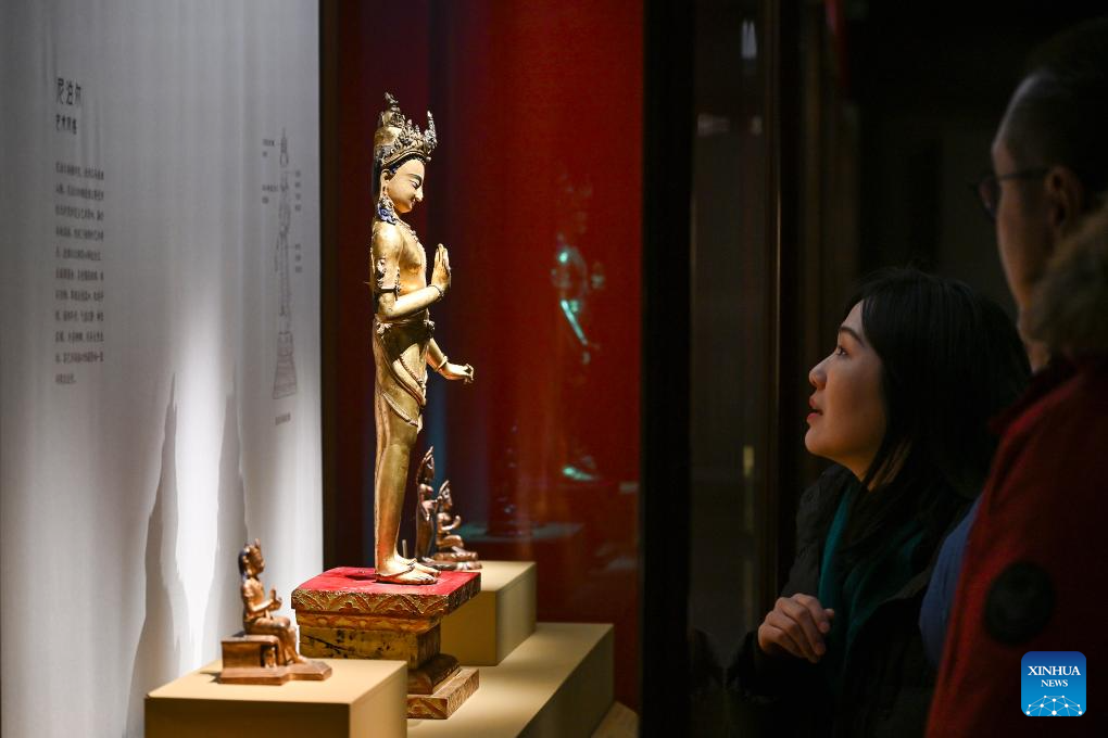 People visit the exhibition "Beyond Time: the history, culture and art of Sakya Monastery" at the Palace Museum in Beijing, capital of China, Feb. 9, 2026. The exhibition, which will last till May 10, showcases over 200 relics reflecting the history, culture and art of Sakya Monastery, the earliest monastery of the Sakya Sect of the Tibetan Buddhism. (Xinhua/Li Xin)